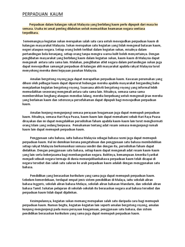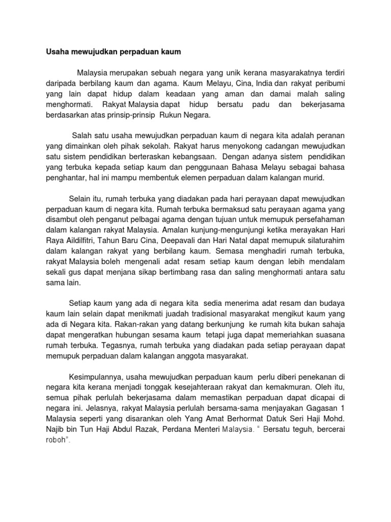 Contoh Karangan Perpaduan Kaum Pt3 Bahasa Melayu Terbaik Berikut di bawah ini kami di MyPT3 ingin berkonsi contoh karangan kepentingan perpaduan kaum di Malaysia sebagai panduan dan sumber rujukan para pelajar. Di samping itu juga bahasa Melayu memainkan peranan penting bukan sahaja di dalam memenuhi keperluan manusia tetapi juga untuk meningkatkan perpaduan antara kaum. Membawa semua kaum di malaysia supaya menghormati setiap hak yang telah ditetapkan oleh perlembagaan.